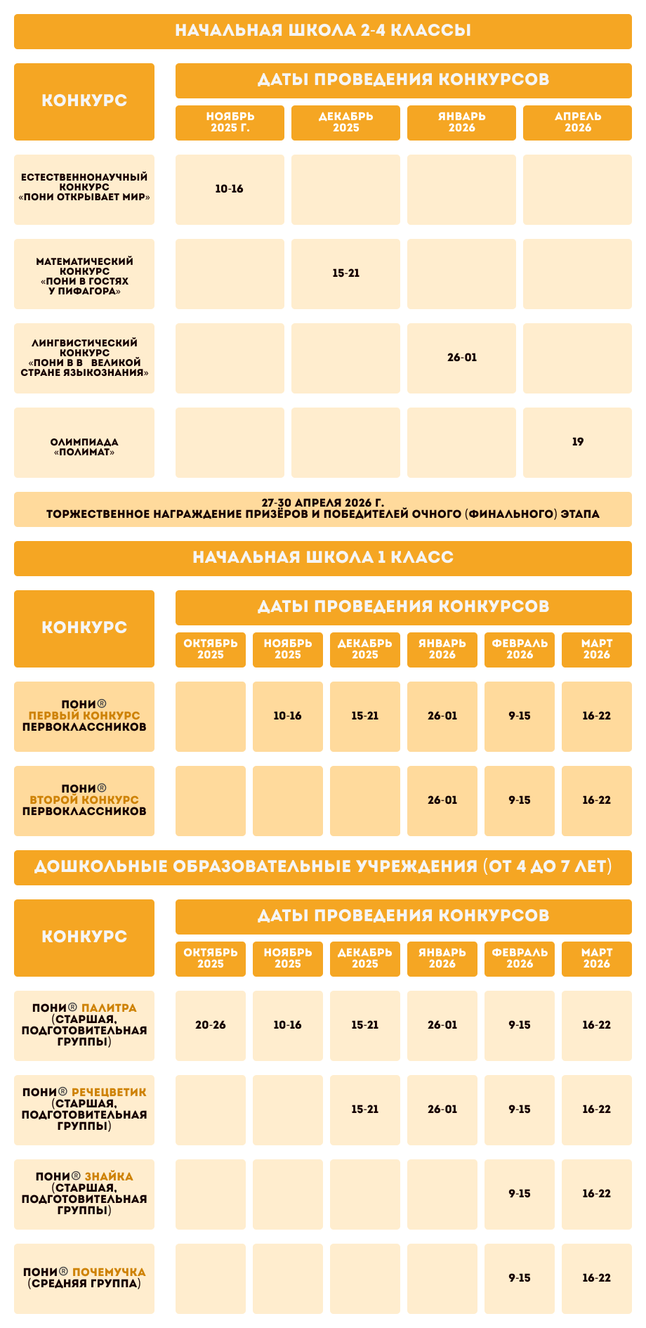 С 2024-2025 учебного года под конкурсами «Пойми! Открой! Найди! Исследуй! (ПОНИ®)» понимаются только конкурсы «ПОНИ – готовься к школе!» и «ПОНИ – первокласснику».