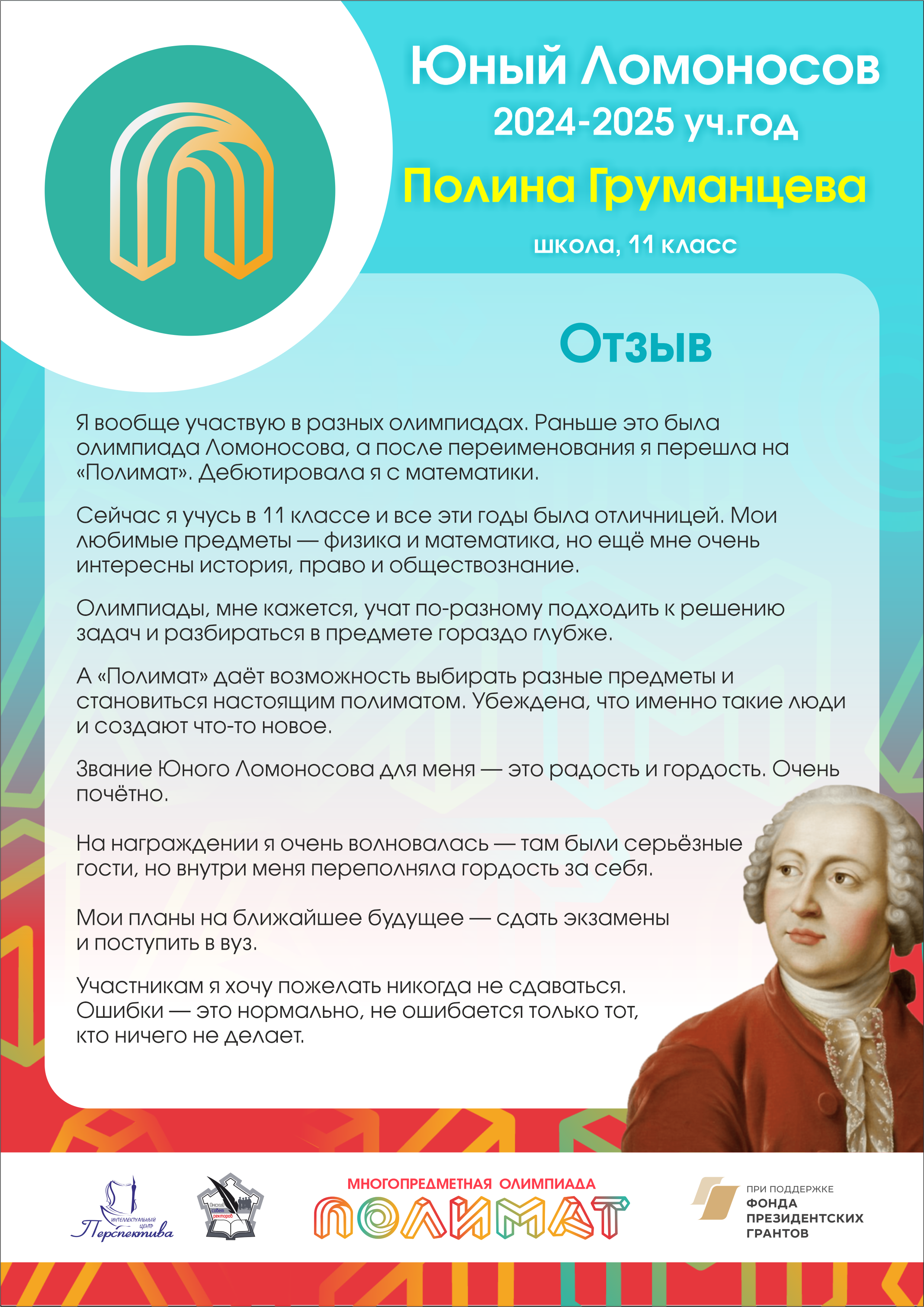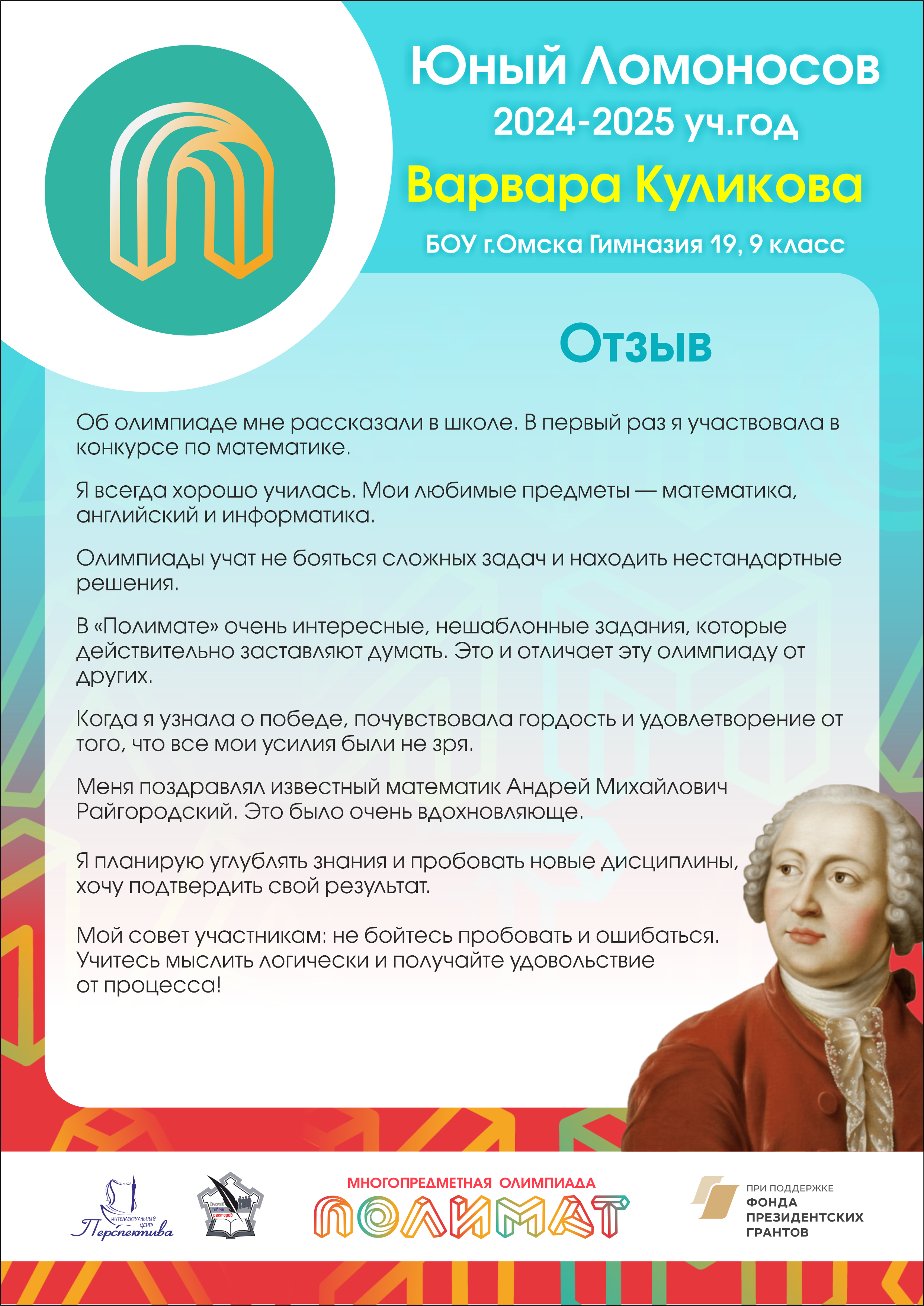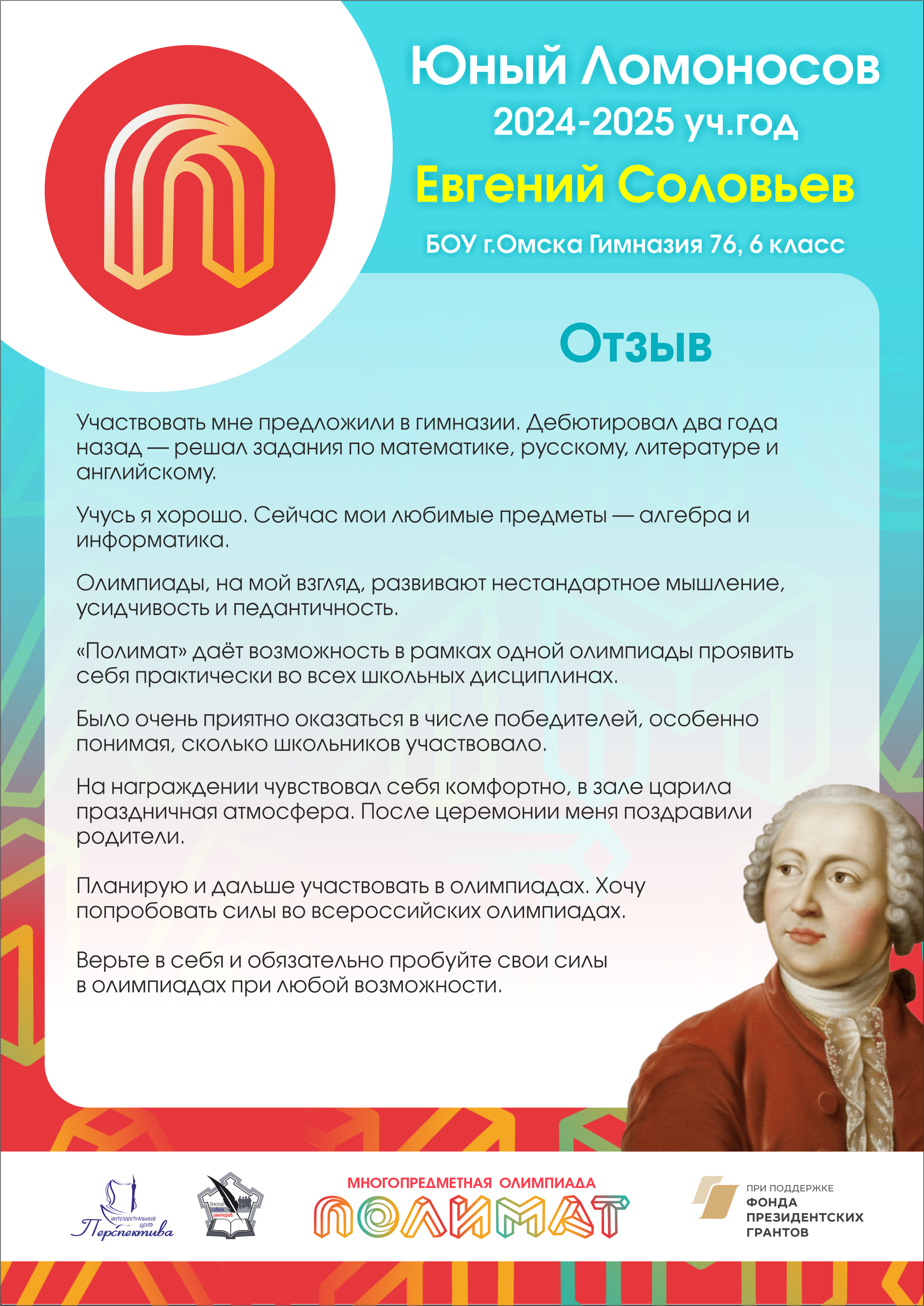 Наш проект получил поддержку Фонда президентских грантов на очный этап! Это не только большая честь и ответственность, но и подтверждение значимости нашей работы. Благодаря этой поддержке мы сможем сделать олимпиаду «ПОЛИМАТ» ещё масштабнее, интереснее и доступнее для школьников со всей страны.